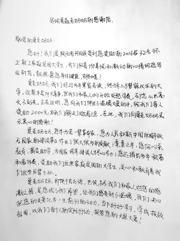 “夏森奶奶为我的母校西街小学提供过很多资助,