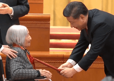 一位98岁高龄的老人,坐着轮椅,被工作人员推上台领奖。她先后两次颤颤巍巍地用手撑着轮椅扶手,试图起身向习近平总书记致意。总书记轻拍她肩膀,并暖心地弯腰俯身为其颁授证书。
