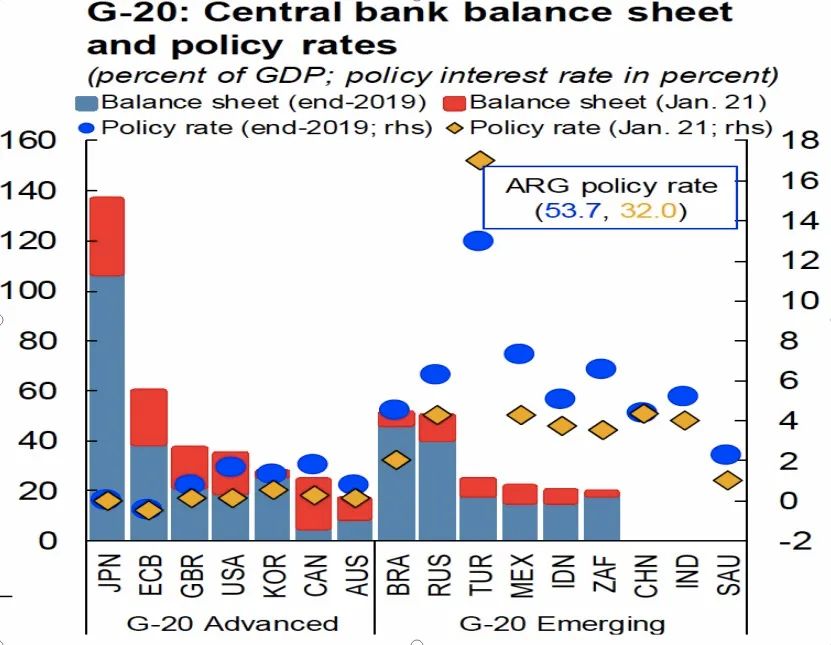 从货币政策看,与一年半以前相比,各国政策利率都有明显下降,但发达经济体货币宽松力度大于新兴市场。图2中,阿根廷远远已经超出图表外,但是阿根廷的政策利率也从危机前的53.7%降至32.0%。