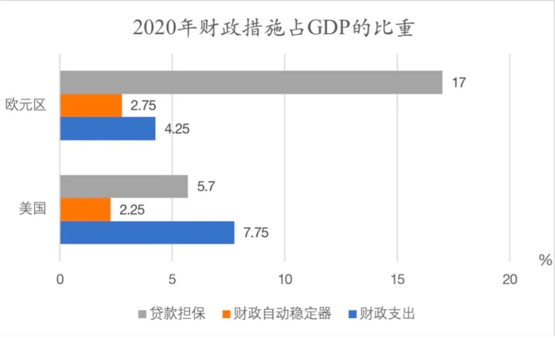 这引起了欧元区一系列官员的不满,纷纷反驳。在财政支出方面,欧盟明显小于美国。但欧盟财政提供的贷款担保占GDP比重明显高于美国,欧盟通过财政担保,刺激了金融市场运作,刺激了经济复苏,未必需要财政直接支出那么多钱。