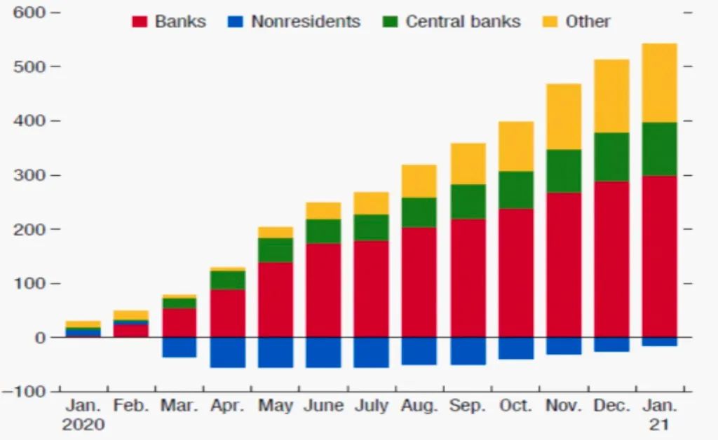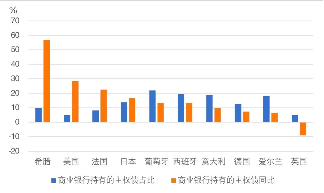 意大利、西班牙、葡萄牙等曾经历过欧债危机的国家,现在约有20%主权债由本国商业银行持有。2020年商业银行主权债敞口增长最快的是希腊,同比增长近60%,美国也同比增长了28%。美国虽然商业银行持有的主权占比不高,但是增速很快,已经引起监管当局的关注。日本商业银行主权债敞口增长相对缓慢,但传统上日本央行持有的国债较多,商业银行持有量反而小于央行。