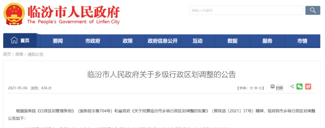根据国务院《行政区划管理条例》(国务院令第704号)和省政府《关于同意临汾市乡级行政区划调整的批复》(晋政函〔2021〕37号)精神,现将临汾市乡级行政区划调整公告如下: