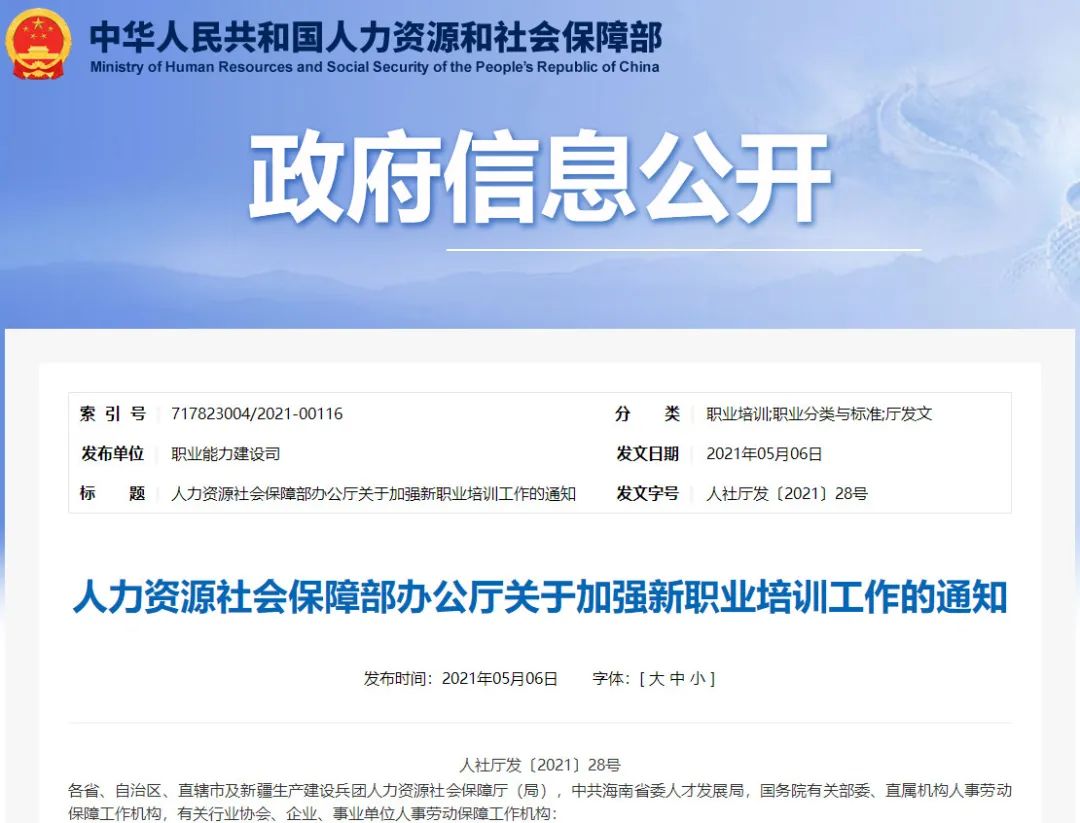 5月6日,人社部发布《人力资源社会保障部办公厅关于加强新职业培训工作的通知》(以下简称《通知》),强调加快培养大批高素质劳动者和技术技能人才,改善新职业人才供给质量结构,支持战略性新兴产业发展,推动数字经济与实体经济深度融合。