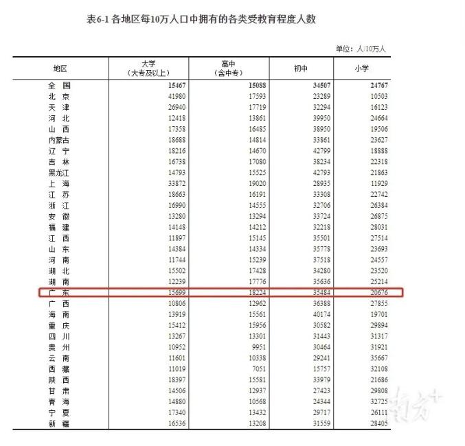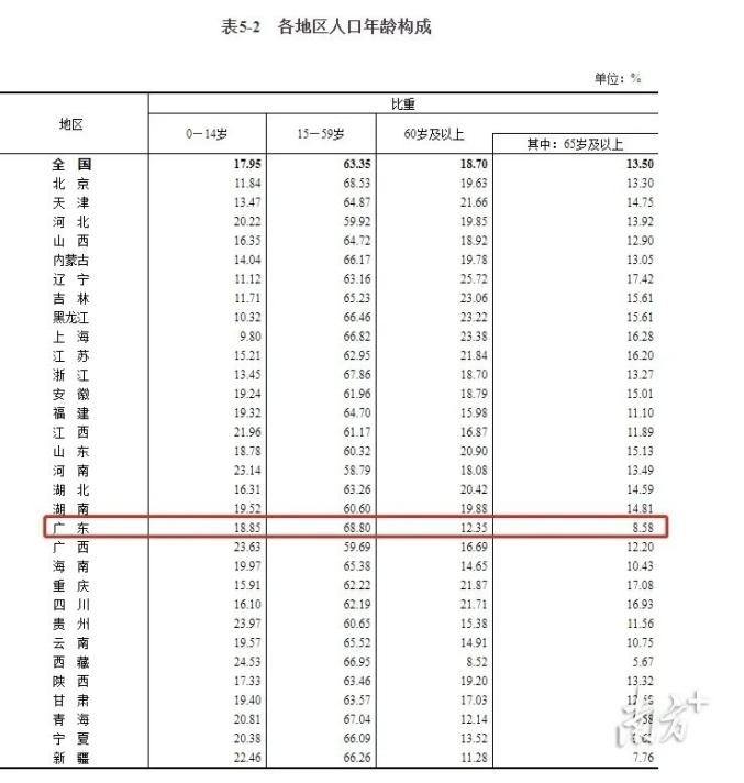 从年龄上看,广东60岁及以上人口占12.35%,与2010年相比提高了2.62个百分点,比全国平均低了6.35个百分点。从受教育程度看,每10万人中大学文化程度的人口数,广东由2010年的8214人上升为15699人,比全国平均多了232人。