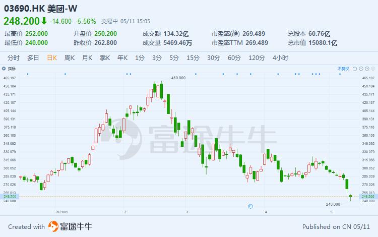 5月11日周二,美团股价开盘大跌,盘中一度跌超8%,午后跌幅收窄至5%左右。截至收盘,美团跌5.25%,股价249港元。