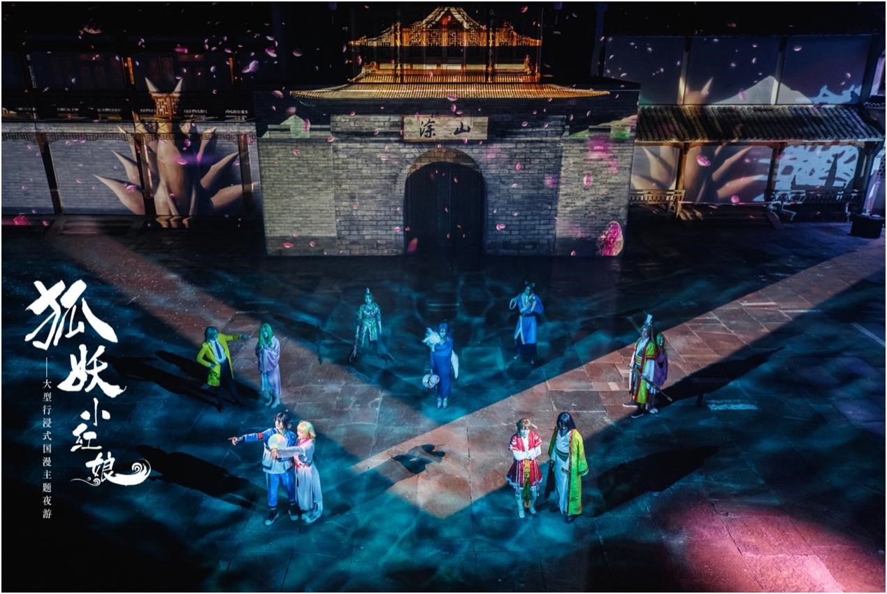 据介绍,《狐妖小红娘》中的涂山苏苏、白月初、王富贵、清瞳等人气角色均“亮相”景区,再加上诸多黑科技,共同上演了一场奇幻的视听盛宴:夜游开启,盛大的礼乐仪式中,五彩光芒射向天际,城墙上投影着一幕幕关于涂山的背景故事。待到涂山城门大开,游客们跟随小妖的脚步进入妖市,街道中的差役在行走巡逻,妖馨斋门前人头攒动,城中居民各司其职,城墙上、阁楼间,小妖们穿行其中,一个繁华而梦幻的妖市展现眼前。
