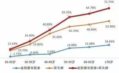 其中以尿失禁发生率最高,有研究表明:在我国大约有三分之一的女性人口受尿失禁的影响,尿失禁患病率随着年龄增长而增加,从20-29岁的7.6%到≥90岁的64.8%。