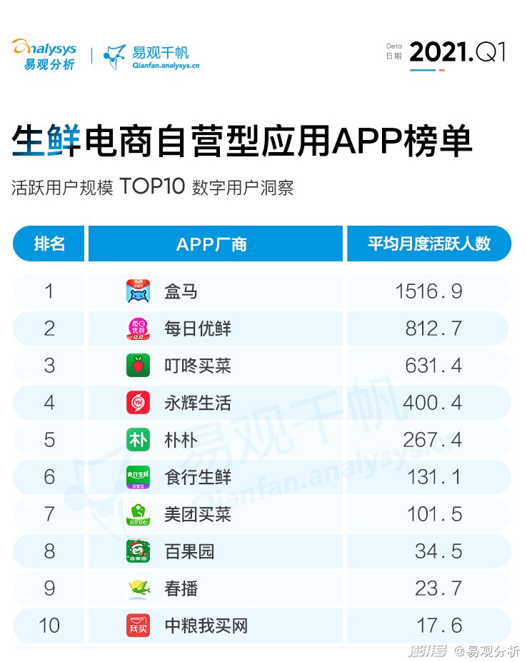 此外,部分自营型生鲜电商在模式的创新与数字能力的输出上也开始加码,比如每日优鲜在本季度宣布将在前置仓的模式之外,切入线下社区零售,用数字化能力改造菜场,并赋能菜场、超市、小店等业态。从独立APP用户的月活角度看,自营型生鲜电商格局依旧稳定。一季度,自营型生鲜电商App中,盒马、每日优鲜、叮咚买菜,分别以1516.9万、812.7万、631.4万的季度平均月活用户规模稳居榜单前三位。