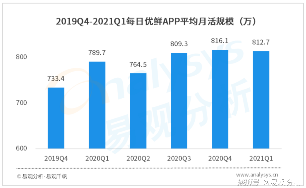 为了保障消费者在春节期间的购物体验,每日优鲜80%的一线员工在此期间留岗,90%的门店照常营业,力保年货商品的极速送达。据易观千帆数据显示,每日优鲜1、2、3月的月活规模分别为771.7万、724.4万、941.9万。分季度来看,每日优鲜一季度APP端平均月活812.7万,微信小程序端平均月活达到657.4万,全域用户流量约为1470.1万。