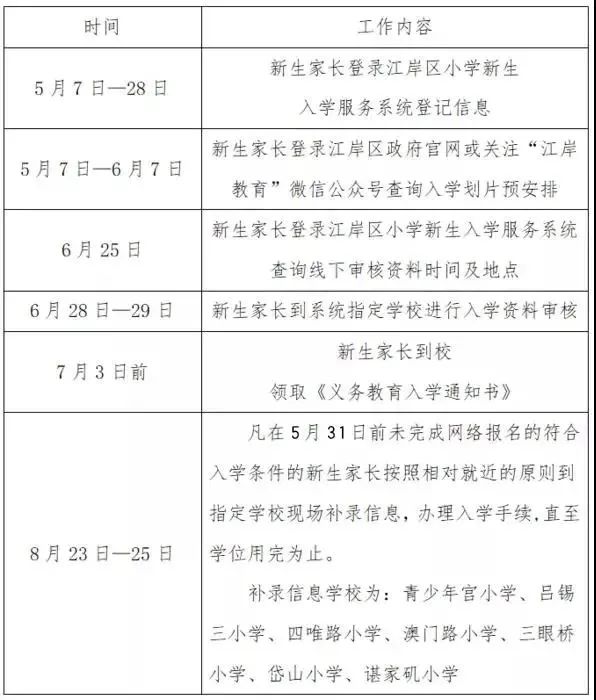 1.摸底公告:学校于5月17日前委托居委会(社区、物业)在本居委会、社区、楼盘张贴摸底登记的公告。明确范围、条件、资料及时间要求;同时张贴东湖高新区一年级新生生源摸底公告,要求家长在规定时间内完成适龄儿童的入学信息注册,平台5月17日8:30开启,5月21日23:00关闭。