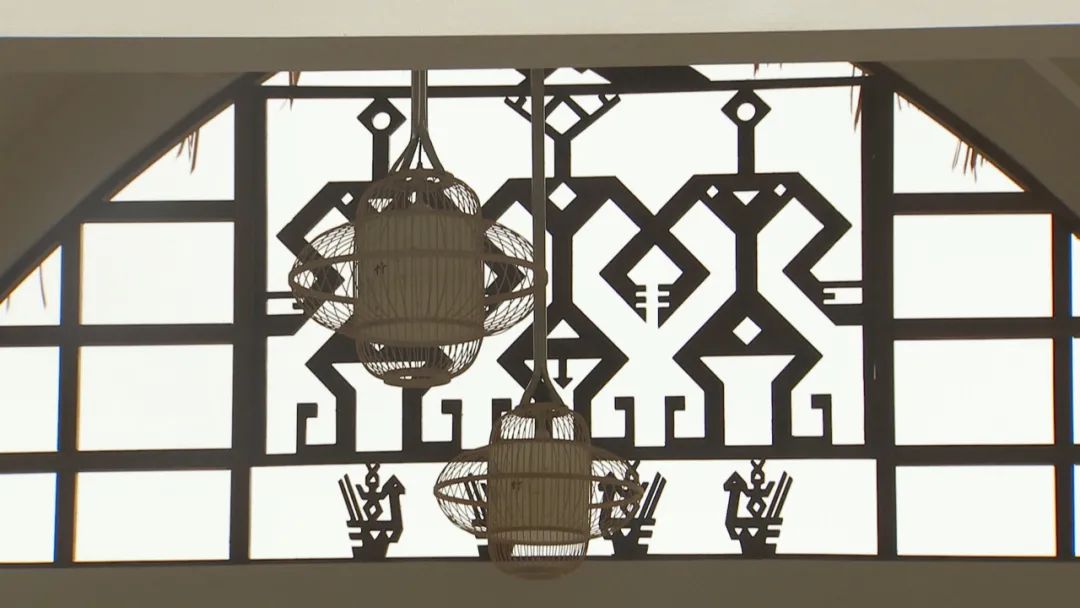 首先,来探一下海南园的秘密花境。在门口,就能看到非常多的海南特色民族元素,可以感受到它的民族风情。现在,从大门口进去看看园中美景吧!