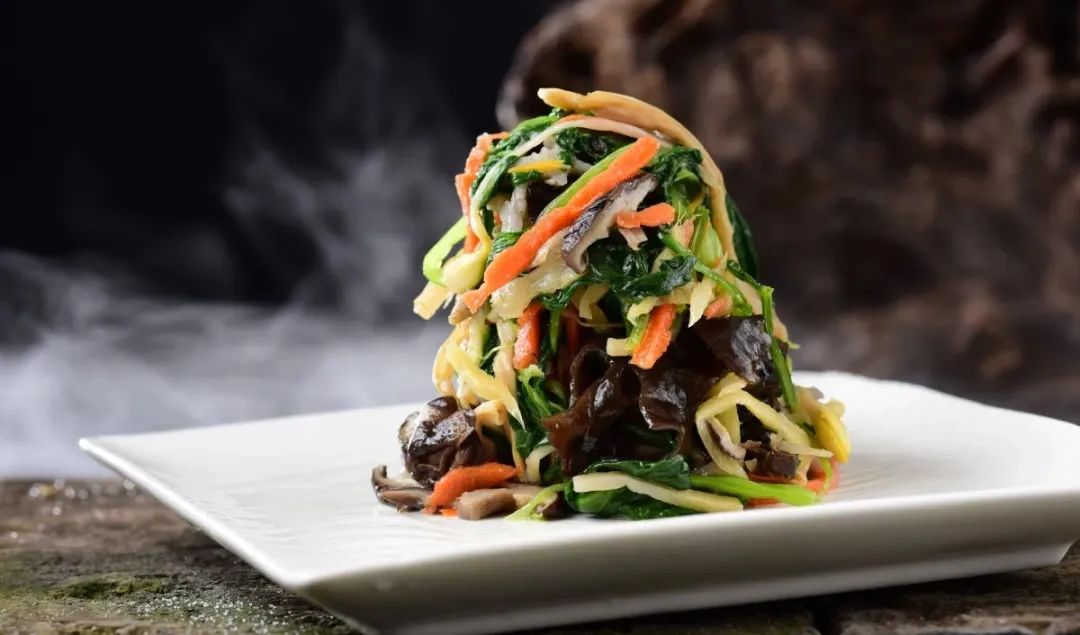 素什锦,又叫“十样菜”,象征着十全十美,由各种蔬菜混合在一起炒成。据《金陵岁时记》载:“除夕人家,以酱姜瓜、胡萝卜、金针菜、木耳、冬笋、白芹、酱油干、百页、面筋十色,细切成丝,以油炒之,谓之十景。”