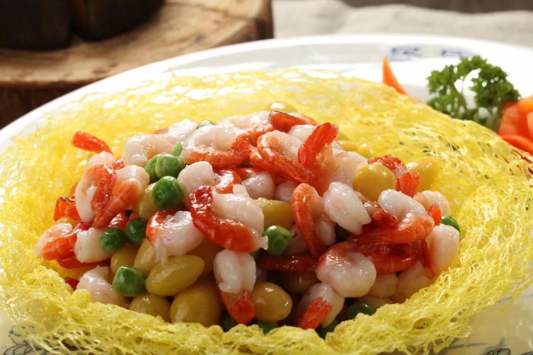 选用鲜活大河虾,以大青虾为最。青虾全部去头壳,身壳,留尾壳,去红筋,上浆,配以青豆,冬菇丁,笋丁,葱白,然后用鸭油爆炒。带着壳的虾仁下锅后红白相间分外好看,成为闻名中外“四大名菜”之一。
