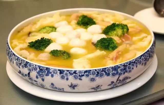 这道菜由海参、鲍鱼、鱼肚、鱼圆、蛋饺等加上新鲜的蔬菜一起熬煮而成,汤汁浓厚鲜美。起名全家福,寓意和和睦睦。
