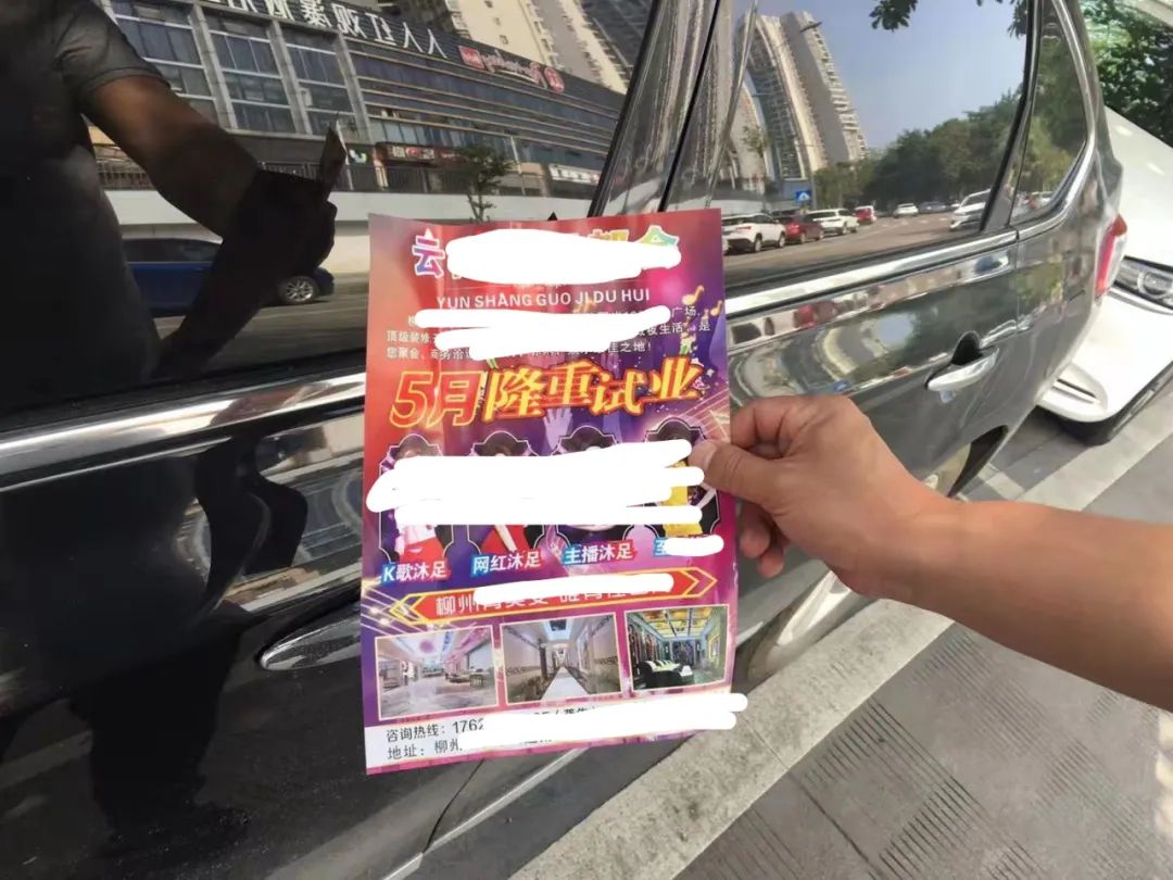 无独有偶,几天后,在滨江东路金沙角观瀑广场周边,几辆停放着的汽车车窗上被塞着一家KTV娱乐场所的宣传广告。城管调查取证后,依据《中华人民共和国广告法》相关规定“未经当事人同意或者请求,擅自向其住宅、交通工具等发送广告”,对该娱乐场所开出6000元罚单。