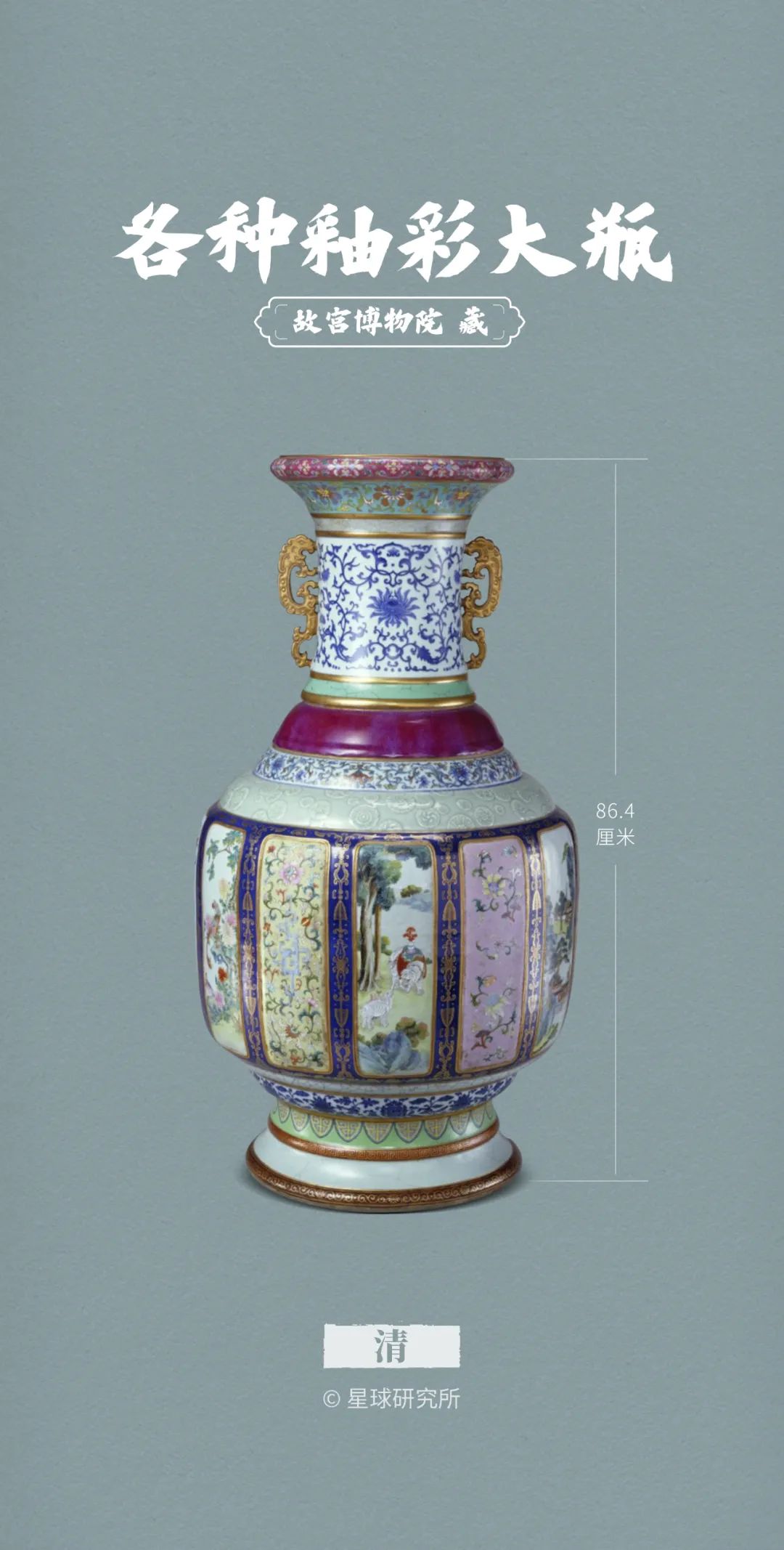 (各种釉彩大瓶,装饰技法包含金彩、珐琅彩、粉彩、青花等,使用的釉包含仿哥釉、绿松石釉、窑变釉、酱釉等,主题纹饰包含三阳开泰、太平有象等十二个吉祥图案,图片来源@故宫博物院)
