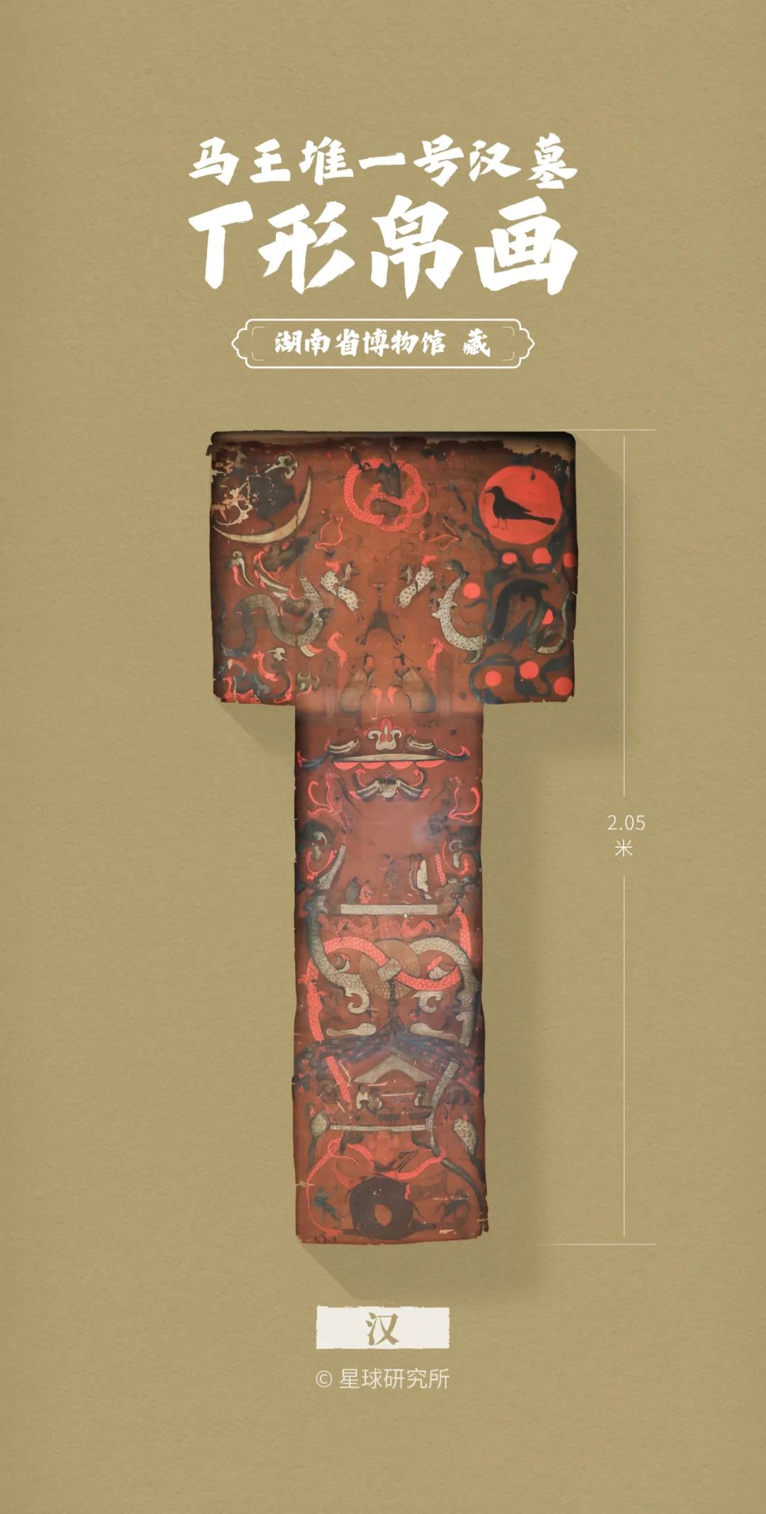 (T形帛画,也叫魂幡,汉代丧葬中安魂安魄的用品,出殡时高举幡,引导墓主人升天,画面中有天上、人间、地下的场景,摄影师@柳叶氘)