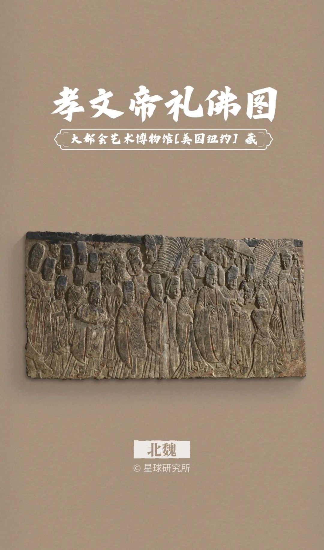 (帝后礼佛图为北魏时期的浮雕作品,是北魏宣武帝为其父母孝文帝和文昭皇后祈福而建,场景为皇帝皇后带领侍从礼佛的画面,后流失到美国两家博物馆,下图为孝文帝礼佛图,图片来源@美国纽约大都会博物馆)