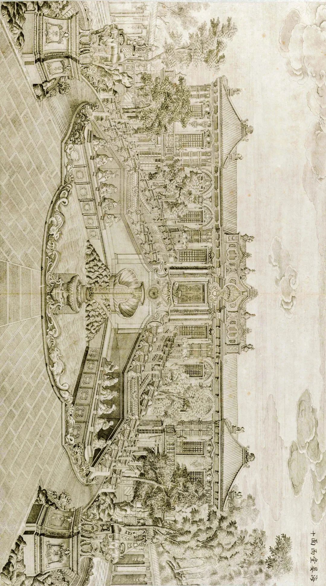 (请横屏观看,圆明园铜版画册中的一幅,创作于1724年,记录了圆明园被毁前的场景,可以看到十二兽首,图片来源@汇图网)
