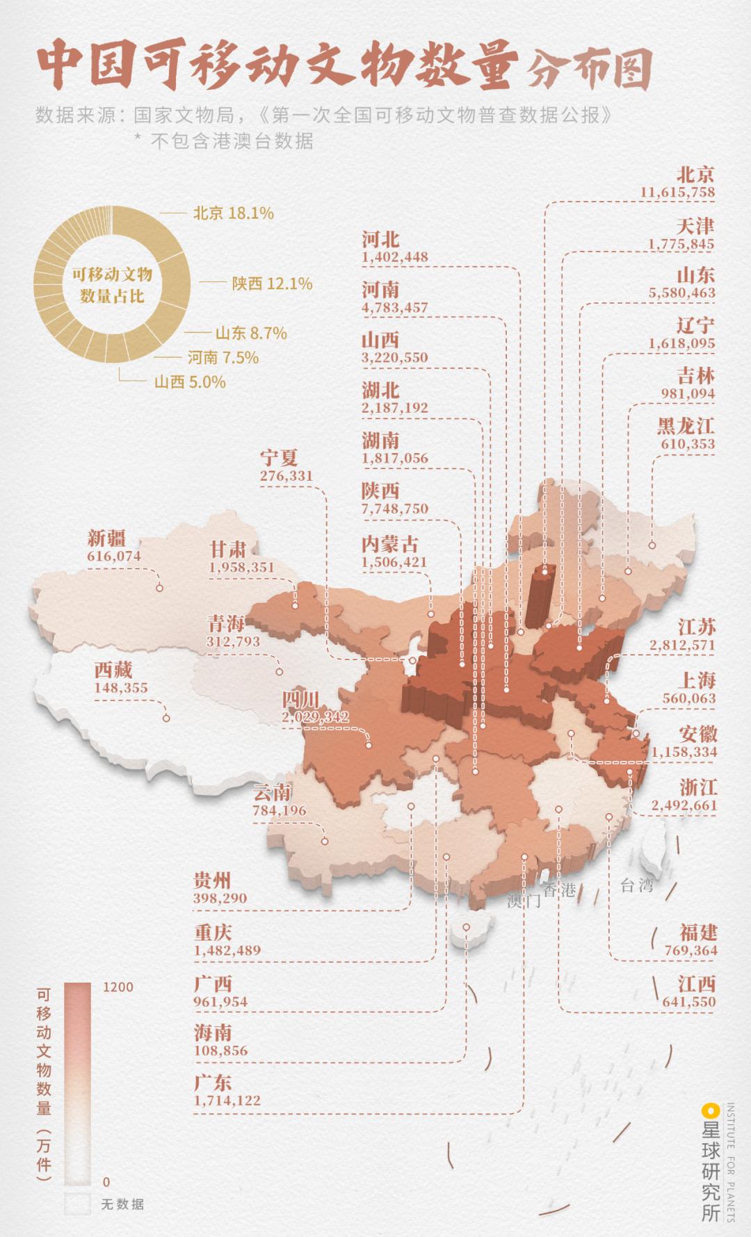 (上述数据出自《第一次全国可移动文物普查数据公报》,截至2016年10月31日,不包括港澳台地区;下图为中国可移动文物数量分布图,制图@郑艺/星球研究所)