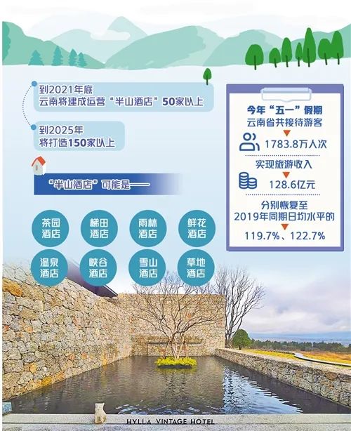 不仅是助力乡村发展,云南省还谋划以“半山酒店”推动旅游产业全面转型升级,带动一二三产业融合发展,助力滇西经济社会持续健康发展。按照计划,到2021年底,云南省将建成运营“半山酒店”50家以上,到2025年将打造150家以上。