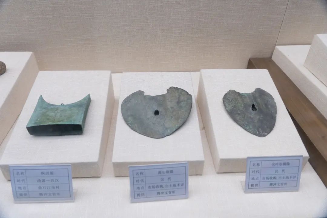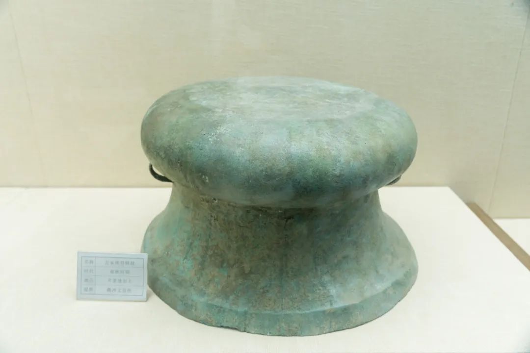 云南出土的百越民族文物,青铜时代以铜鼓最具代表性。铜鼓是越人文化的代表性器物之一,这面石寨山型铜鼓,鼓面小于鼓身,胴、腰、足三段分明。胴部图案为“羽人”、小船(船上有人作划船动作),腰部为驼峰牛纹。石寨山型铜鼓在腾冲出土,更证明了腾冲古代有百越民族的分布。