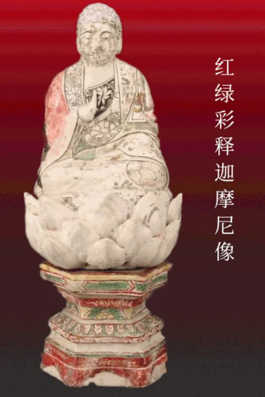 收藏于磁州窑历史博物馆内的红绿彩释迦摩尼像高62厘米,是全国乃至世界上最大的一尊红绿彩佛像。释迦佛结跏趺坐在精美的莲花座上,他的头为低平螺髻,整个脸长圆,丰满而润腻,给人一种可亲、可近、可爱、可敬的感觉。造像躯体壮硕,宽肩阔胸。衣纹线条流畅自如,佛装施彩敷色华丽繁缛,这也是它的珍贵之处。