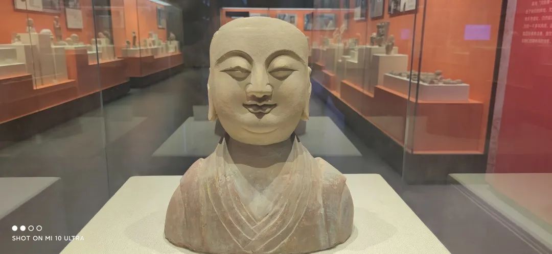 陈列于管内的罗汉头其造型憨态可掬,慈眉善目,嘴角微扬,每一处雕刻都体现了古代工匠的雕刻技术精湛,这尊唐代罗汉像流露出来的微笑似乎有一种能量,可以消融你内心所有的不悦,这种面容被称为“峰峰微笑”。