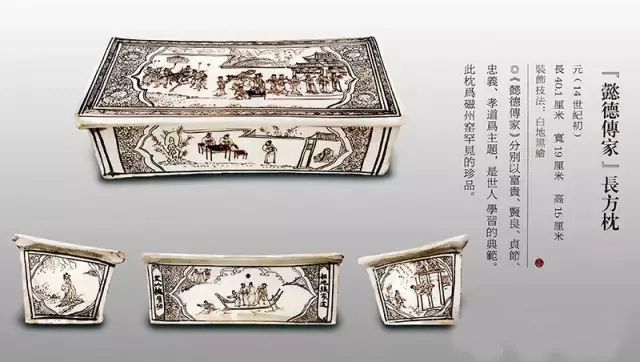 收藏于馆内的一方元代懿德传家长方磁枕分为前、后、左、右、上五个部位,分别以富贵、贤良、孝道、贞节、忠义为主题,描绘了五个女性故事,故名《懿德传家》长方枕,是磁州窑罕见的珍品。