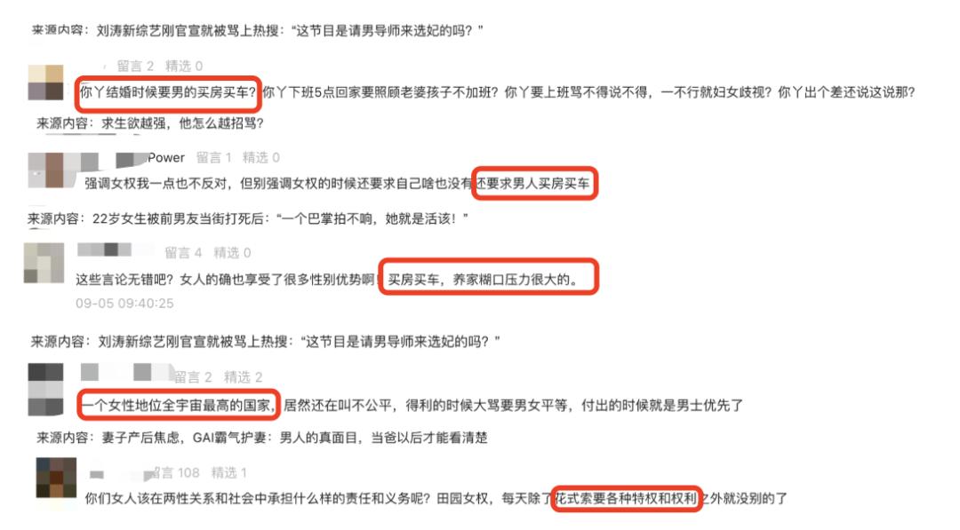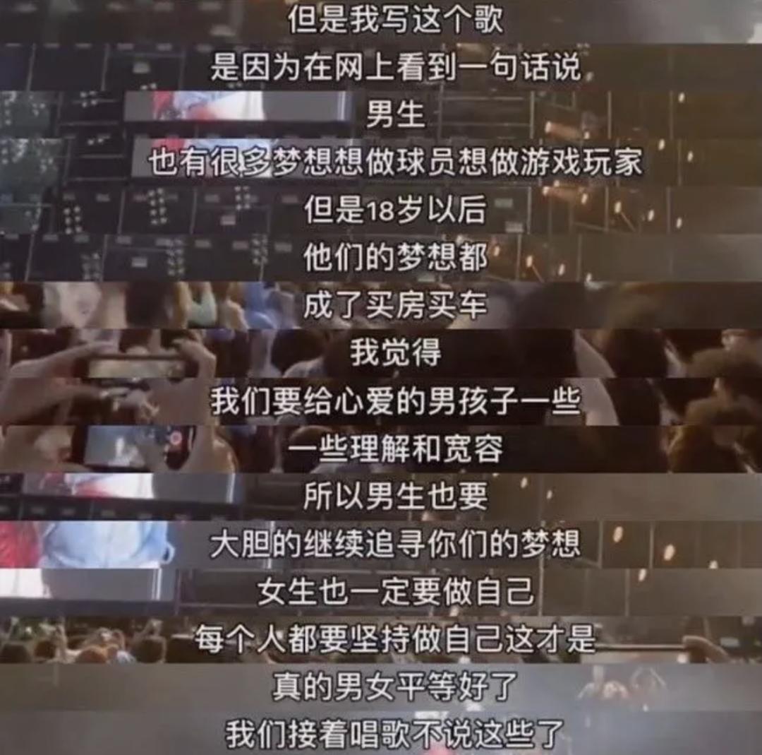 但上下文一结合,可能会让人觉得她的话里,藏着“男生为了女生,拼命买房买车,压力那么重,都是因为女生不够理解和宽容”的潜台词。
