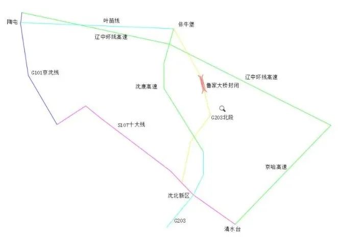 绕行线路二:经沈北新区国道绥沈线(S203)向北至沈康高速公路至依牛堡互通。