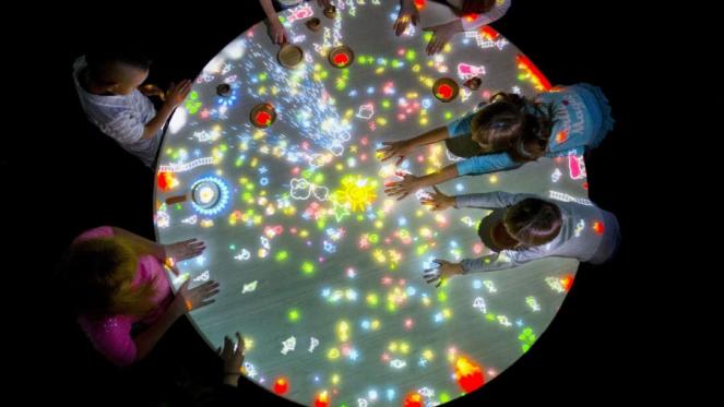 装置作品中,小人会在桌子的互动屏幕边缘奔跑。孩子可把不同的物件放在桌上与小人互动,改变其移动轨迹,让他们跳跃、攀爬或在物件上滑行。