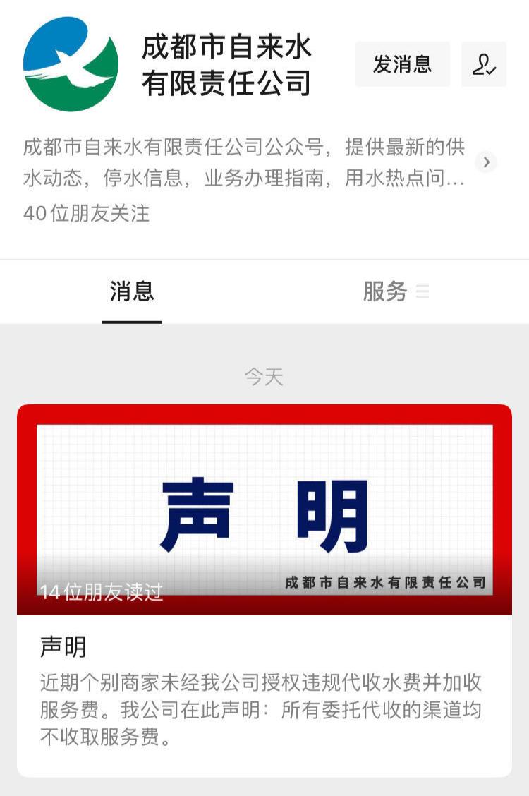 原标题:《代收水费要加收服务费?成都市自来水公司声明来了》