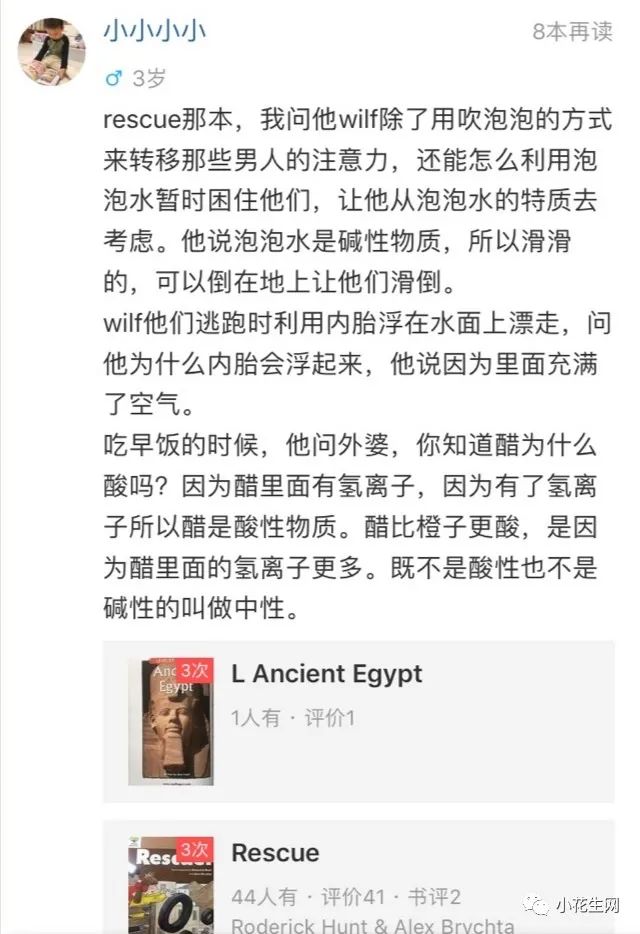 在练习自读的过程中,亲子阅读也一直进行着,以科普为主。娃把科普书里学到的带到了生活中,并时常给身边的人科普,一旦打开话匣子就滔滔不绝。