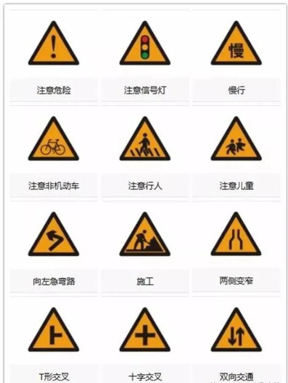 警告标志是指警告车辆、行人注意危险地点的标志。警告标志的颜色为黄底、黑边、黑图案,形状为等边三角形,顶角向上。
