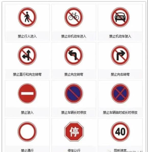 禁令标志是对车辆加以禁止或限制的标志,起到禁止某种行为的作用。禁令标志的颜色,除个别标志外,为白底、红圈、红杠、黑图案、图案压杠。禁令标志的形状为圆形、八角形、顶角向下的等边三角形。