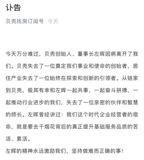 原标题:《突发!贝壳创始人左晖去世,身家超两千亿,为地产新首富》