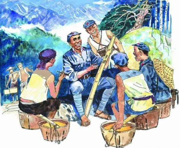 从宁冈茅坪到井冈山上的茨坪有60多里山路,峰险路陡、坎坎坷坷、曲曲弯弯,十分难走。井冈山军民没有被困难吓倒,运粮队伍不辞艰难往返这条洒满血汗的山路,谱写了官兵一致、患难与共的动人乐章!1928年冬日的一天,天刚麻麻亮,朱德军长又带领部分红军战士和赤卫队员到宁冈砻市挑粮。这天,朱军长像往日一样精神饱满,穿着一身灰布军装,背着斗笠,扎着腰带,打着绑腿,穿着草鞋下山去。来到龙市,战士们有的用箩筐担,有的用口袋背;没有工具的战士索性脱下长裤,把裤口扎紧,把粮食装满两条裤腿,往肩上一搭一样方便。这样,大家挑的挑、背的背,翻山越岭,穿行在井冈山的蜿蜒山径上。