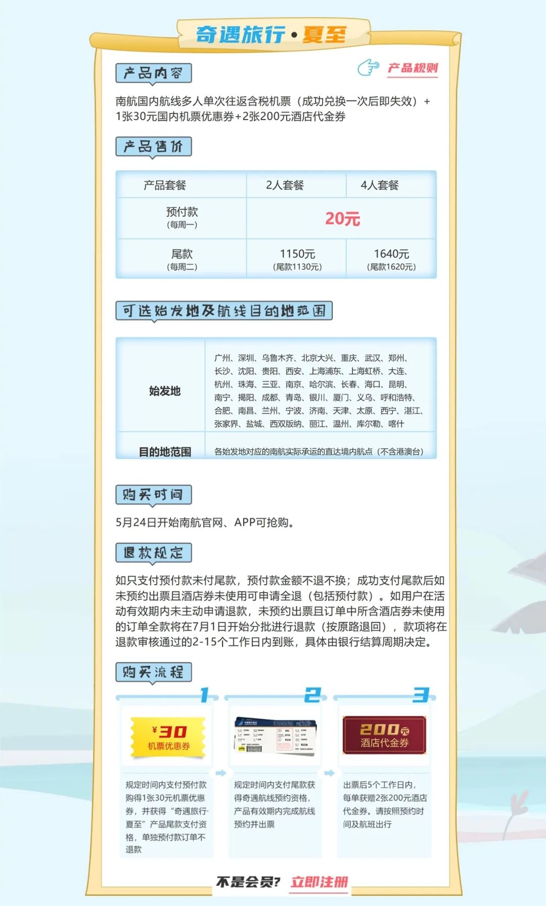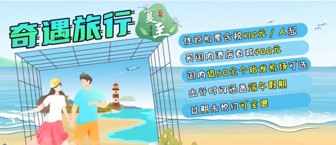 5月20日,南航奇遇旅行盲盒系列推出夏至版本。往返机票含税410元/人起,国内近50个始发机场可选,出行时间涵盖端午假期,过期未预约可全退。