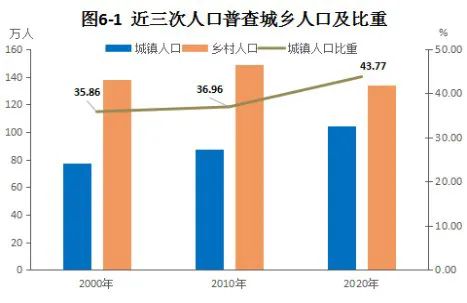 全市常住人口[3]中,居住在城镇的人口为1043289人,占43.77%;居住在乡村的人口为1340061人,占56.23%。与2010年第六次全国人口普查相比,城镇人口增加170986人,乡村人口减少147764人,城镇人口比重提高6.81个百分点。