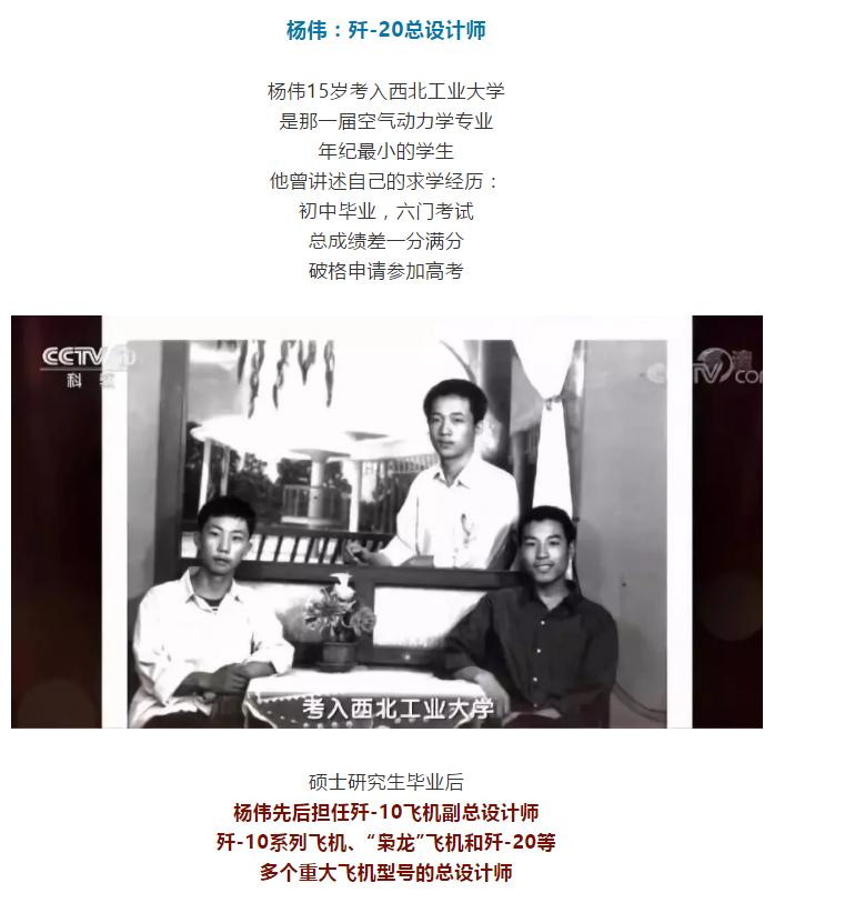 1982年,杨伟本科毕业于西北工业大学飞机系空气动力学专业,1985年硕士毕业于西北工业大学飞机系飞行力学专业。多年后,杨伟已经是中国科学院院士,是我国航空工程领域杰出的7型飞机的总设计师。从我国第一型自主研发的歼-10到我国新一代外贸机“枭龙”、“枭龙”双座,从歼-10的系列改进型歼-10双座、歼-10A、歼-10B、歼-10C到歼-20,为我国航空科技发展做出了突出贡献。