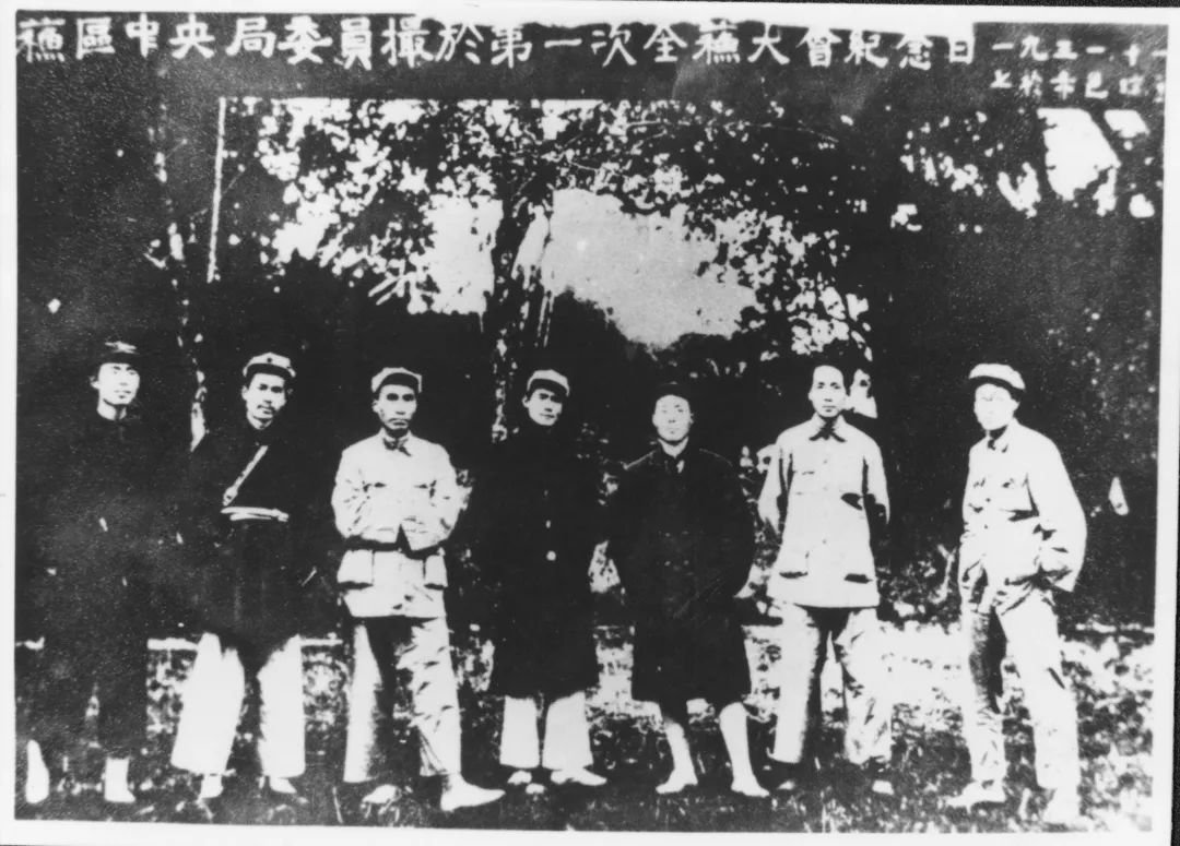 △ 顾作霖(左1)与毛泽东(左6)、朱德(左3)等其他苏区中央局委员在瑞金的合影。