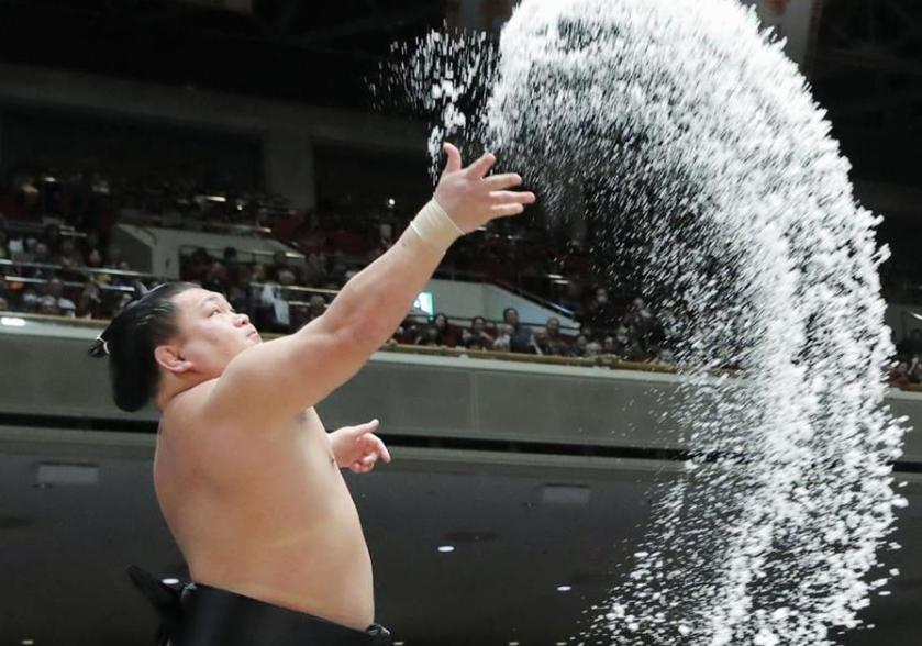 相扑正式比赛前,双方选手均撒盐祈求不在比赛中受伤,同时保佑比赛胜利丨sanspo