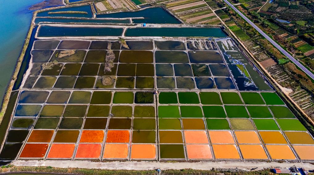 威海荣成港西镇的盐田。五颜六色的盐田,实则是其中各盐池咸度、结晶速度、藻类等引起的颜色差异丨图虫创意