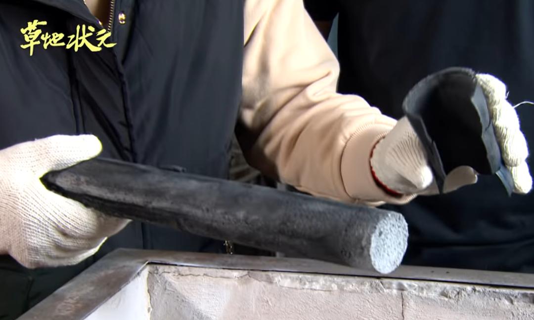 烧制成的竹盐不仅呈灰黑色且凝固成竹筒的形状,外表的竹筒也变成了活性炭材料丨youtube / 草地状元
