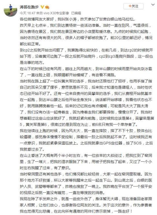 “活着比什么都好,这是我这辈子最难忘的一天。”在此次甘肃山地马拉松比赛中,张小涛当时跑在前六名,他也是最前面六人中唯一幸存者。