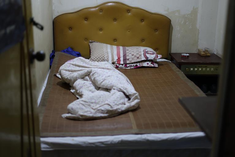 房间几乎没有旅馆的标准配置,没有卫生间,没有布草,一张黄色的破床贴在墙面,另一面放着一个茶几,在进门口的地方,还有一张和茶几配对的桌子,掉漆的桌面和脱皮的木床,像是上个世纪的物件,又或者说是老板收的破烂。