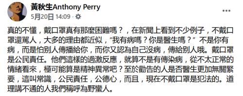 停工后的黄秋生宛如“防疫标兵”,常在脸书上大骂不戴口罩的台湾民众是“野蛮人”“脑残”。