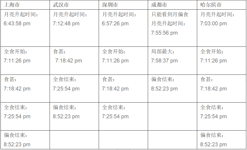 东南沿海大部分城市,能看到月全食全过程,即超级红月亮。中西部的城市,由于月亮尚未升起,赶不上月全食的开始,武汉能赶上全食的食甚,成都则只能看到月偏食。