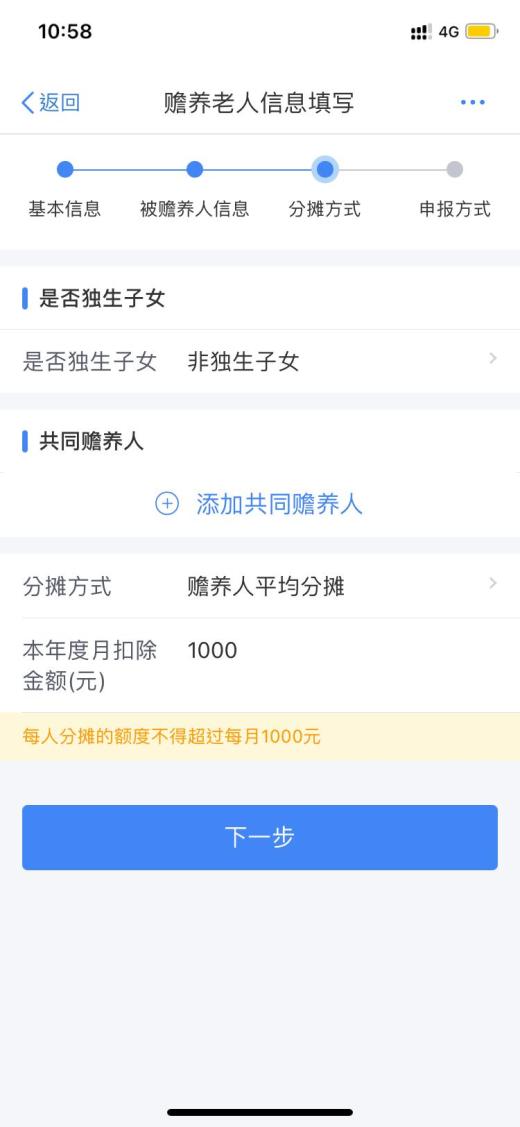 (二)纳税人为非独生子女的,由其与兄弟姐妹分摊每月2000元的扣除额度,每人分摊的额度不能超过每月1000元。可以由赡养人均摊或者约定分摊,也可以由被赡养人指定分摊。约定或者指定分摊的须签订书面分摊协议,指定分摊优先于约定分摊。具体分摊方式和额度在一个纳税年度内不能变更。